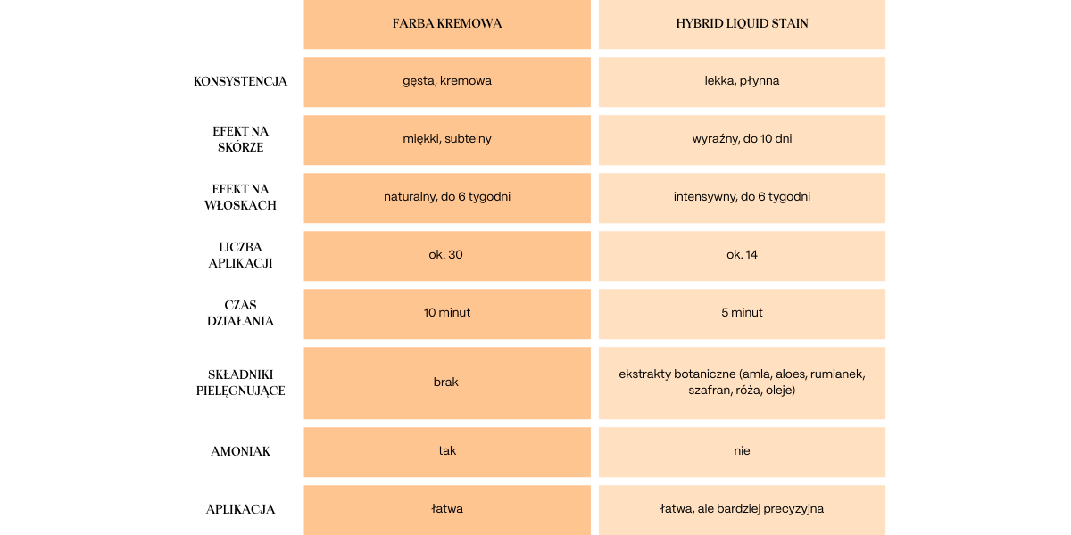 W porównaniu do klasycznych formuł kremowych, hybrydowa farba w płynie pozostawia więcej pigmentu na skórze, tworząc efekt przypominający makijaż - bez konieczności codziennego używania kredek czy pomad do brwi. Jednocześnie pigment wiąże się z włosem, zapewniając długotrwałą intensywność koloru.