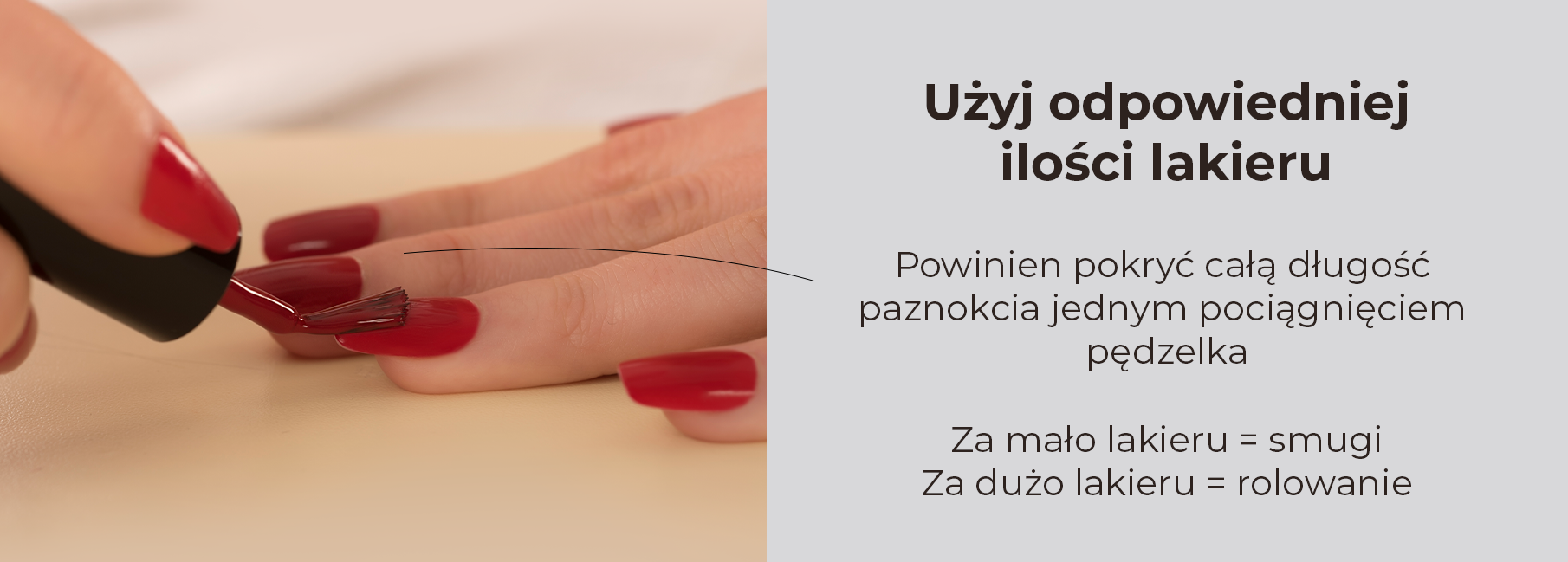 Idealna ilość lakieru powinna pozwolić Ci pokryć cały paznokieć jednym ciągłym ruchem, bez konieczności „dociągania” produktu.