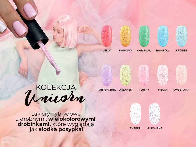 Zbliża się specjalna okazja i szukasz idealnego pomysłu na nietuzinkowy manicure? A może po prostu jesteś fanką oryginalnych stylizacji? Koniecznie poznaj nasze lakiery hybrydowe z kolekcji Unicorn. Lakiery do paznokci unicorn to aż 12 przepięknych kolorów z delikatnymi, wielokolorowymi kropeczkami. Dzięki temu wyglądają na paznokciach jak słodka posypka! A może to prawdziwy pył jednorożca? Paznokcie wykonane lakierami unicorn błyskawicznie stworzą piękną i niepowtarzalną stylizację, a ty zachwycisz swoje klientki! Każdy z lakierów unicorn posiada inny kolor bazowy oraz inny kolor drobinek, dzięki czemu za pomocą jednej kolekcji uzyskasz wiele różnych efektów końcowych. Jeśli zależy ci na prawdziwym efekcie “wow”, możesz dodatkowo dopasować ozdoby do paznokci. Paznokcie unicorn sprawdzą się zarówno na specjalne okazje takie jak impreza oraz jako urozmaicenie na co dzień. Kolorowe drobinki z pewnością przyciągną spojrzenia, a ty stworzysz unikatowy design już za jednym pociągnięciem pędzelka. Słodkie nazwy kolorów takie jak Milkshake czy Partymazing sprawią, że nie będziesz mogła im się oprzeć! Stwórz całe paznokcie w stylu unicorn lub połącz tą kolekcję z jednolitymi lakierami bez drobinek. Niezależnie od tego, czy słodkie drobinki będą stanowić tylko dodatek, czy grać główną rolę, efekt z pewnością będzie oszałamiający! Kremowa konsystencja oraz niewyczuwalne pod palcami drobinki dodatkowo wpływają na komfort aplikacji. Mocna pigmentacja zapewnia doskonałe krycie już po jednej warstwie. Czy wybrałaś już swój ulubiony lakier unicorn spośród całej kolekcji?